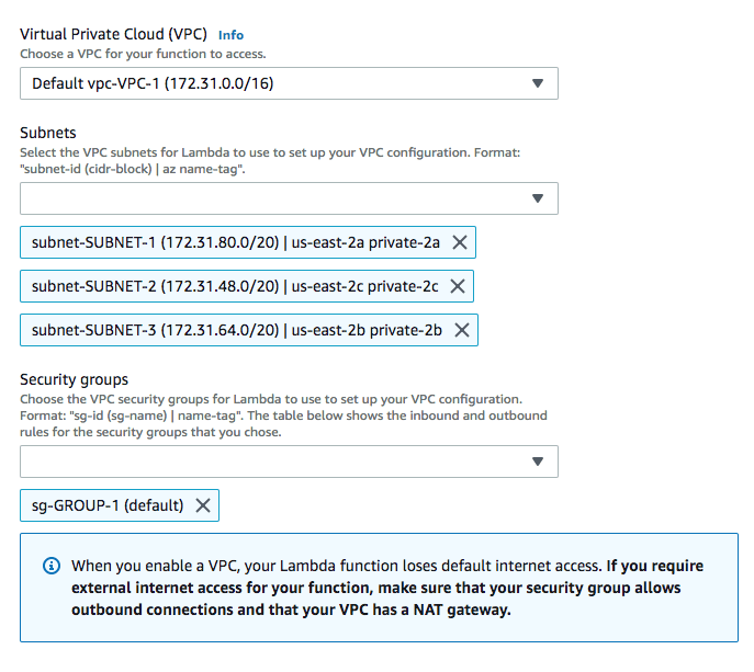 Well, the DocumentDB connection cannot be established because, as already mentioned, our Lambda function and DocumentDB cluster must reside in the same VPC. To do that, just scroll down to the Network section and select the correct VPC, its subnets, and an adequate security group.