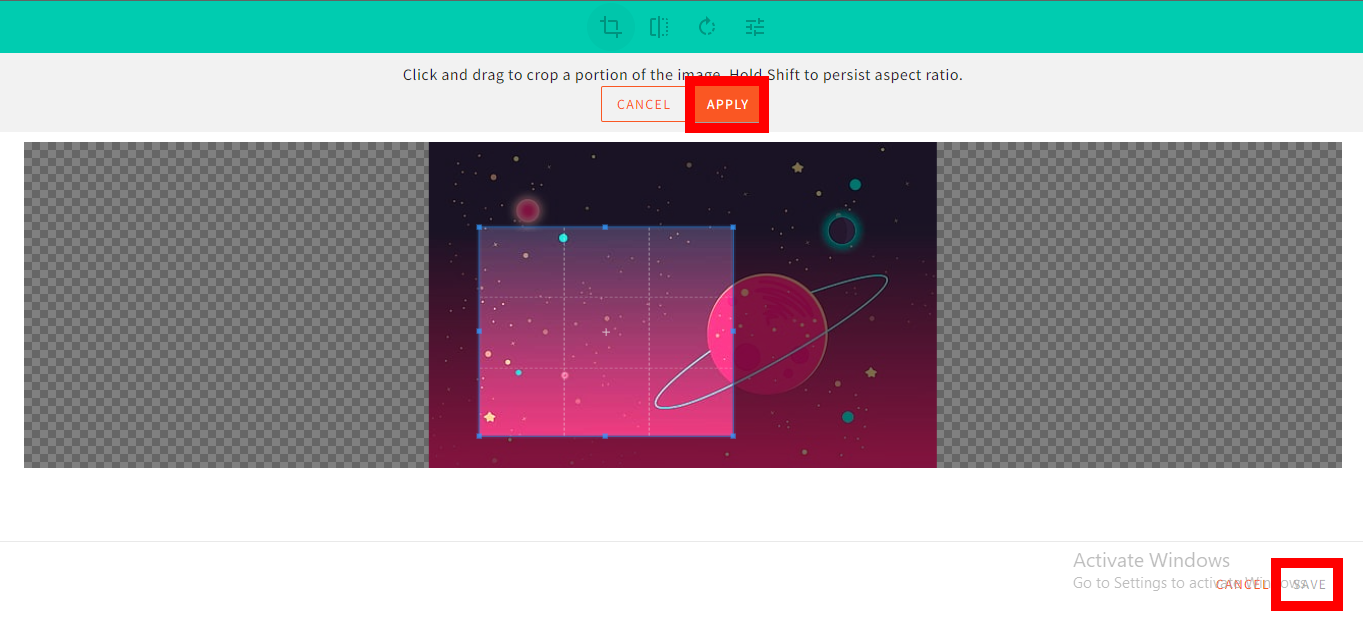 Now click on the cropping option between the red box for cropping the image, now you will be on a new page: