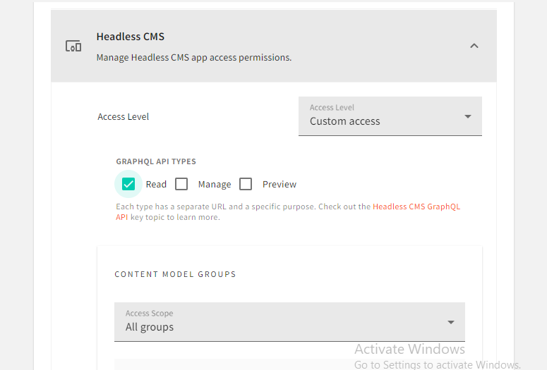 Now scroll down and under “Headless CMS” set the access level to “custom access” and select “read”: