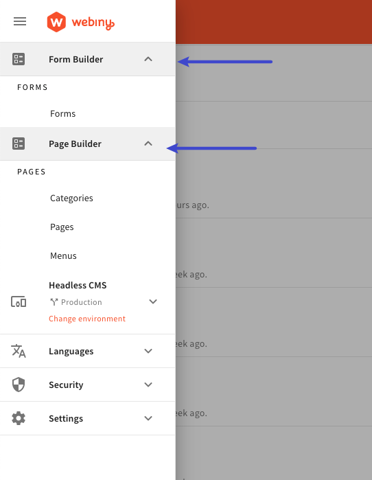 The “Content” section in the main menu is replaced with the “Page Builder” and “Form Builder” sections (#1082)