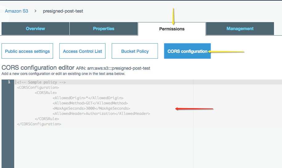To fix that, simply open your bucket in the S3 Management Console and select the “Permissions” tab, where you should be able to see the “CORS configuration” button.