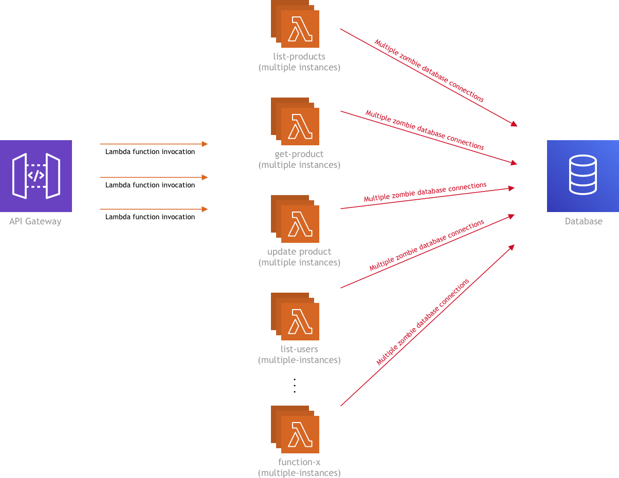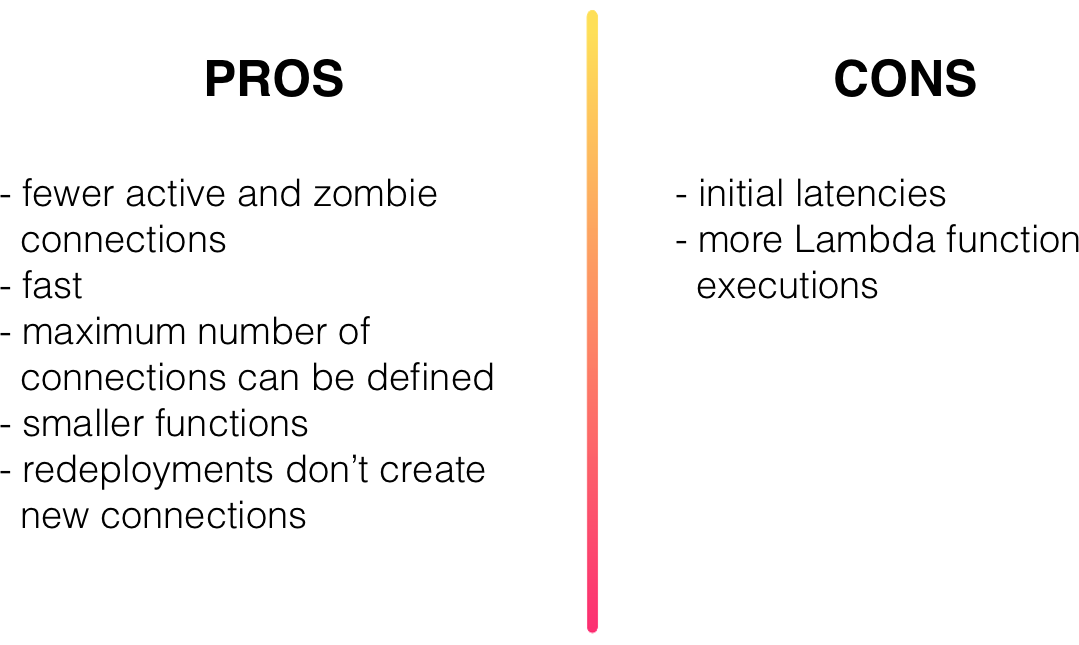 Occasionally, we might need to deploy several services, which might be comprised of several functions. If we were to deploy 20 new functions, and if all of them were talking to the database, that would basically mean we’ll get 20 zombie connections after the deployment has finished (assuming we have only one instance of each function), and establish 20 new ones. Things get even worse if you had to repeat the deployment once or twice.