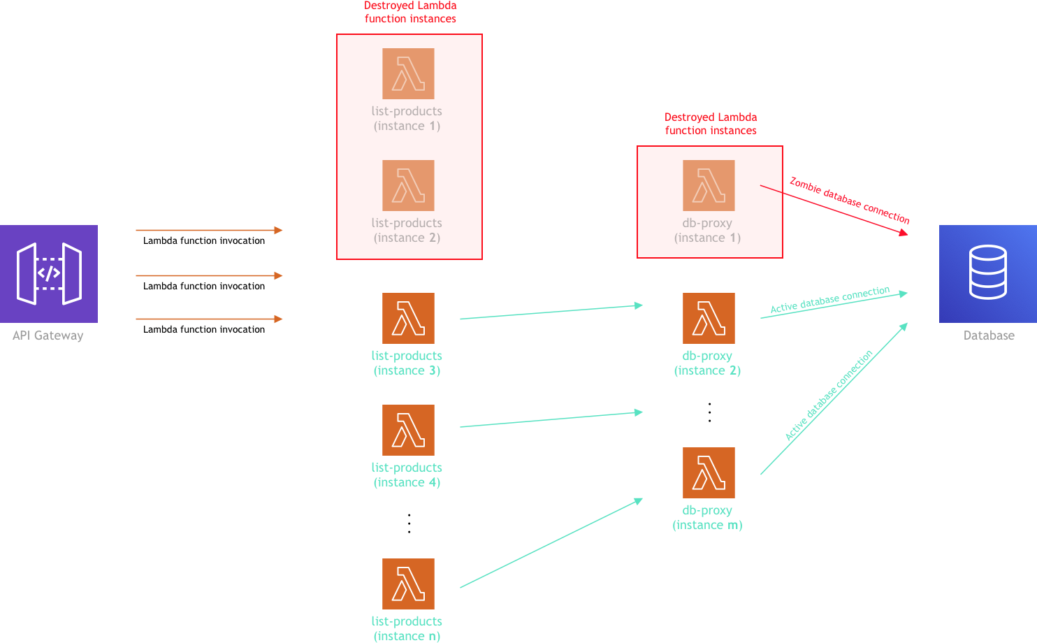 But still, as mentioned, do note that the DB Proxy Lambda function instances will be destroyed at some point in time, which will again leave zombie connections behind. So the actual number of total open connections to the database server may be a bit higher than the one set as the function’s reserved concurrency.