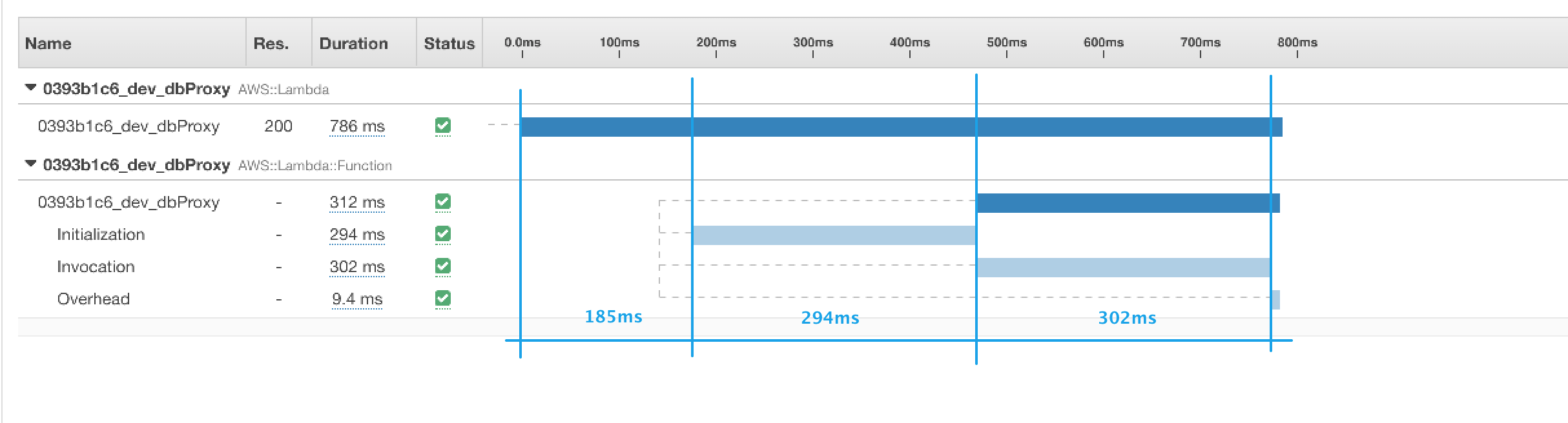 As we can see, we first have a 185ms long cold start, followed by a 294ms initialization process. This is actually the execution of the code that is located outside of the exported handler function, which happens only on this initial invocation. Finally, we have a 302ms of actual handler execution, in which we probably have ~280ms or more waisted due to the new database connection establishment.