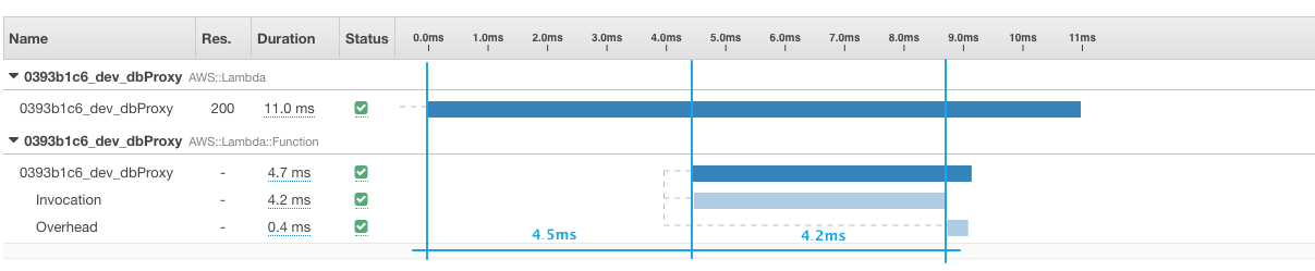 But after that, there is no initialization step we’ve seen in the previous diagram. We’ve immediately jumped to the invocation, which this time lasted for 4.2ms, which is the actual database query execution. Finally, with the overhead, we are looking at a total of 11ms.