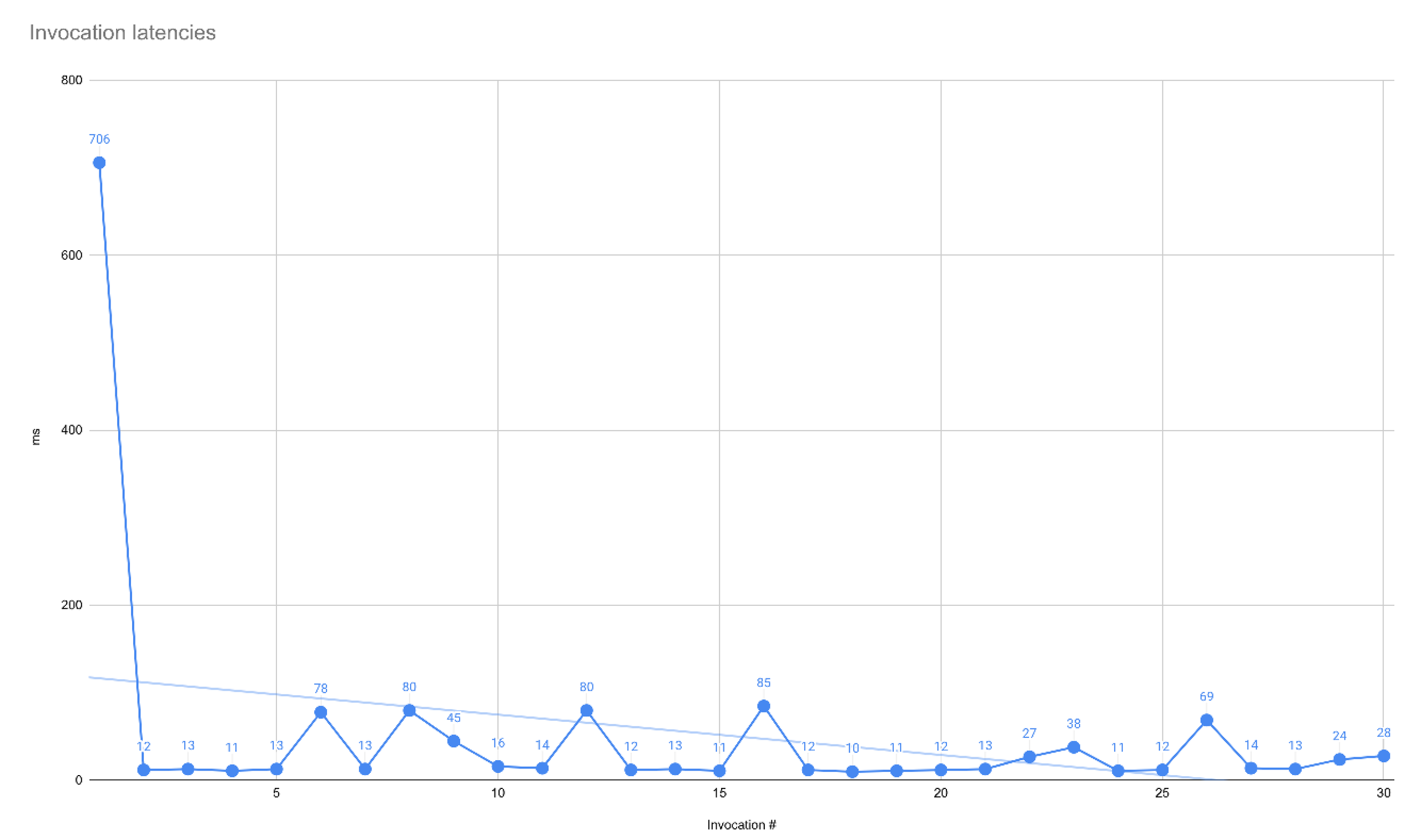 Except for the initial cold-start invocation, we can see that most of the time we are dealing with latencies that are in the 10–20ms range. If we would calculate the average, excluding the initial 706ms, we would get 27.24ms.