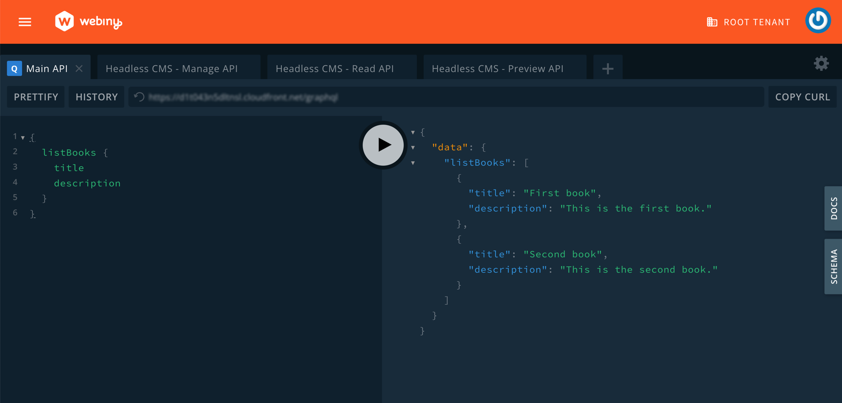 Testing the listBooks query in the API Playground Run yarn webiny watch admin --env ENVIRONMENT_NAME to start the Admin app in the development mode. Replace ENVIRONMENT_NAME with the name of the environment you’re working on.