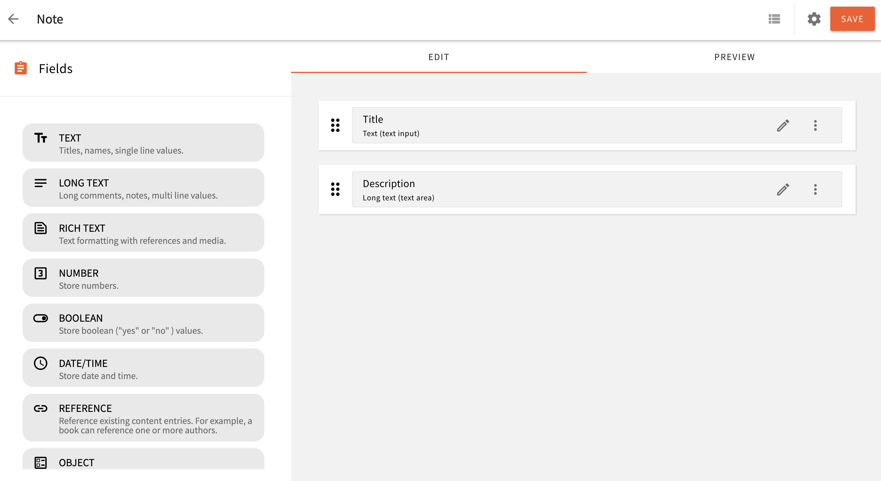 We’ll set up a Note content model with the following fields: