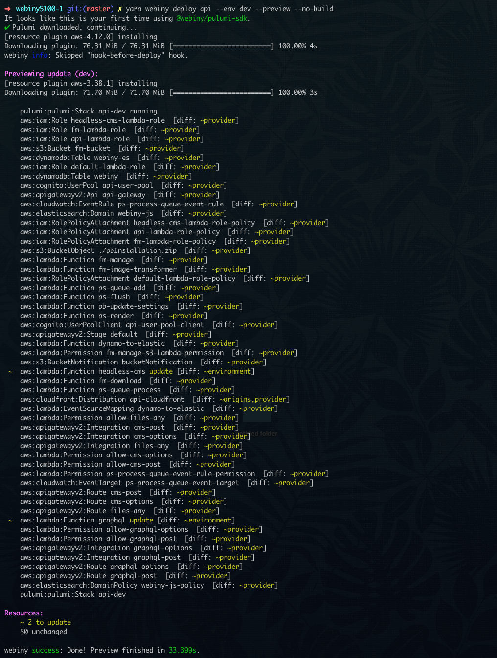 Once you’ve run the above shown webiny upgrade command, the existing Pulumi CLI should automatically be removed from your project. And, upon redeploying your Webiny project (using the webiny deploy command), the new Pulumi CLI should be downloaded and installed, again automatically.